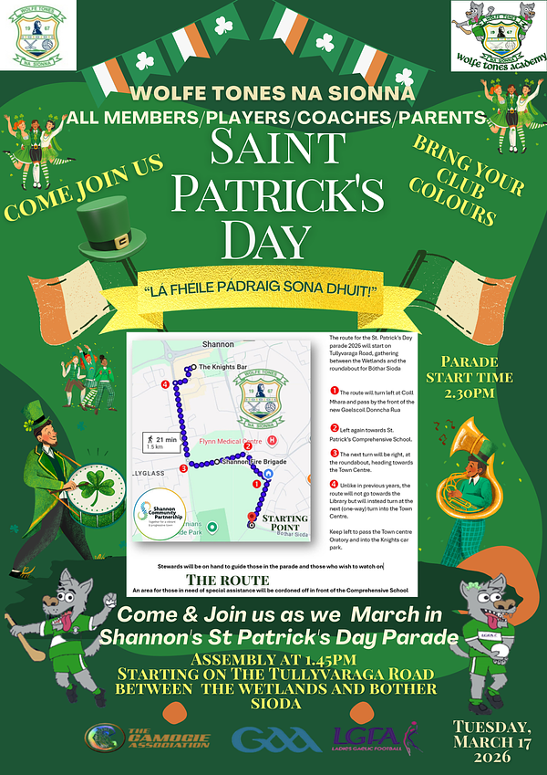 As Shannon Largest Sporting Academy, let have a big turn out for St Patrick's Day Parade This year-All support welcome to march.